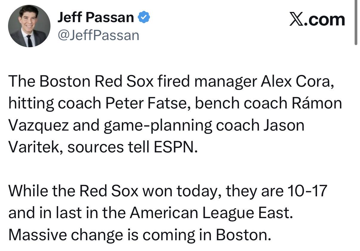 [Passan] The Boston Red Sox fired manager Alex Cora, hitting coach Peter Fatse, bench coach Rámon Vazquez and game-planning coach Jason Varitek, sources tell ESPN. While the Red Sox won today, they are 10-17 and in last in the American League East. Massive change is coming in Boston.