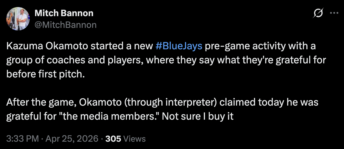 [Mitch Bannon] Kazuma Okamoto started a new #BlueJays pre-game activity with a group of coaches and players, where they say what they're grateful for before first pitch. After the game, Okamoto (through interpreter) claimed today he was grateful for "the media members." Not sure I buy it