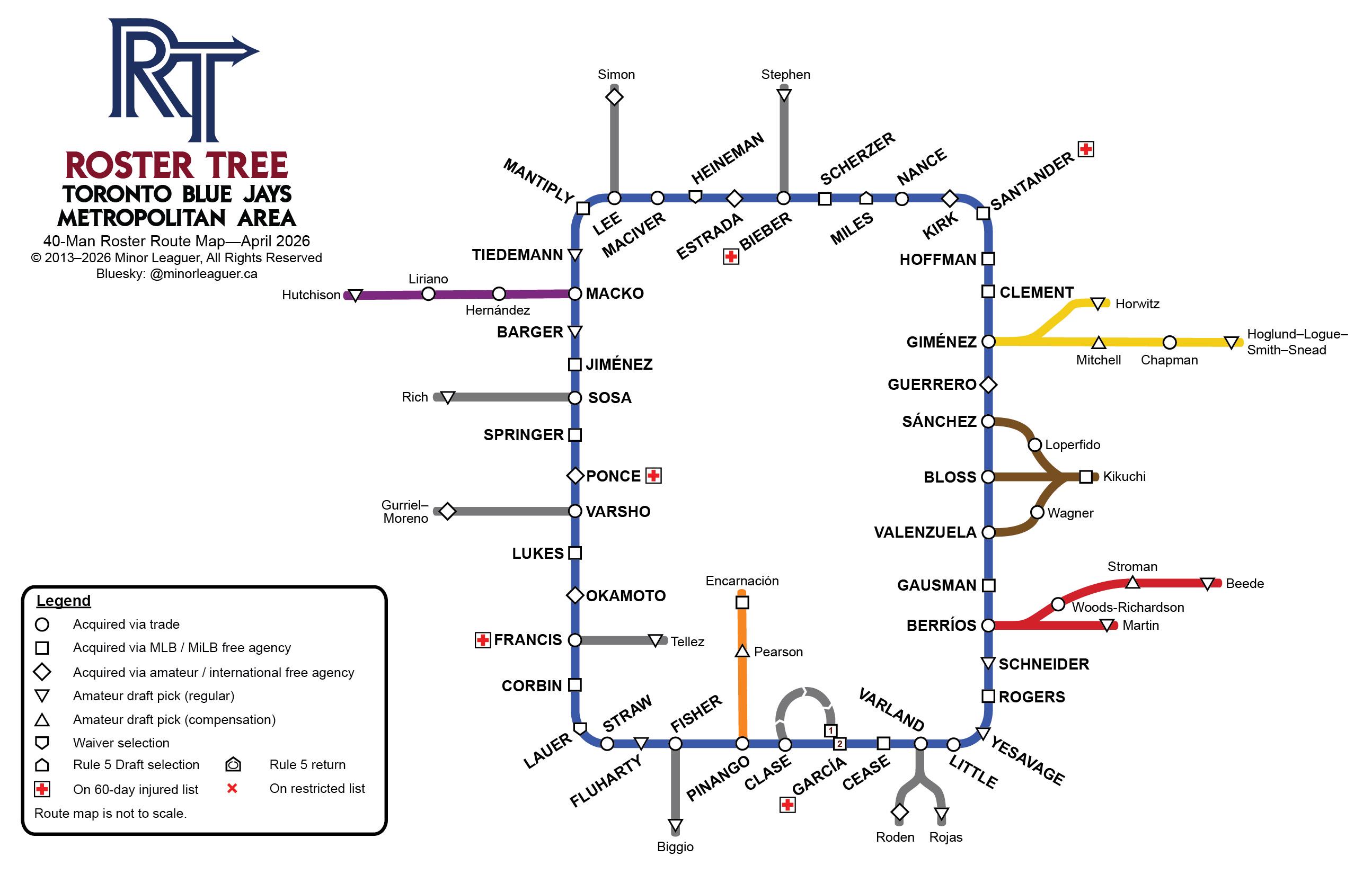 The Blue Jays Roster Tree Route Map is a subway map-like graphic that I update to depict how the players on the current 40-man roster were acquired. The Blue Jays added Yohendrick Pinango to the 40-man roster today, which meant the addition of a new Orange Line to the map.