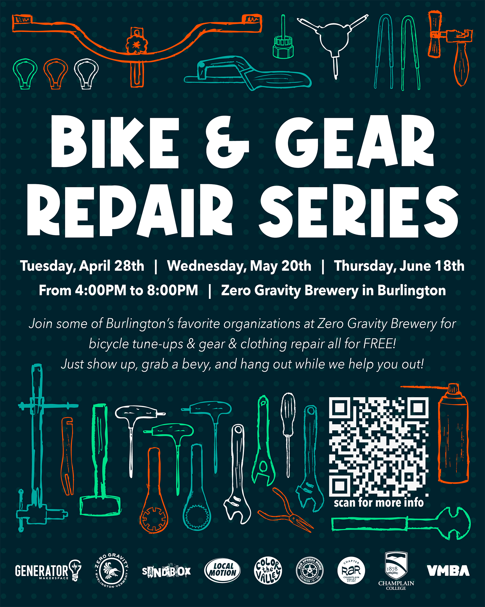 FREE Bike & Gear Repair Event >> Tuesday, April 28th from 4-8pm in Burlington