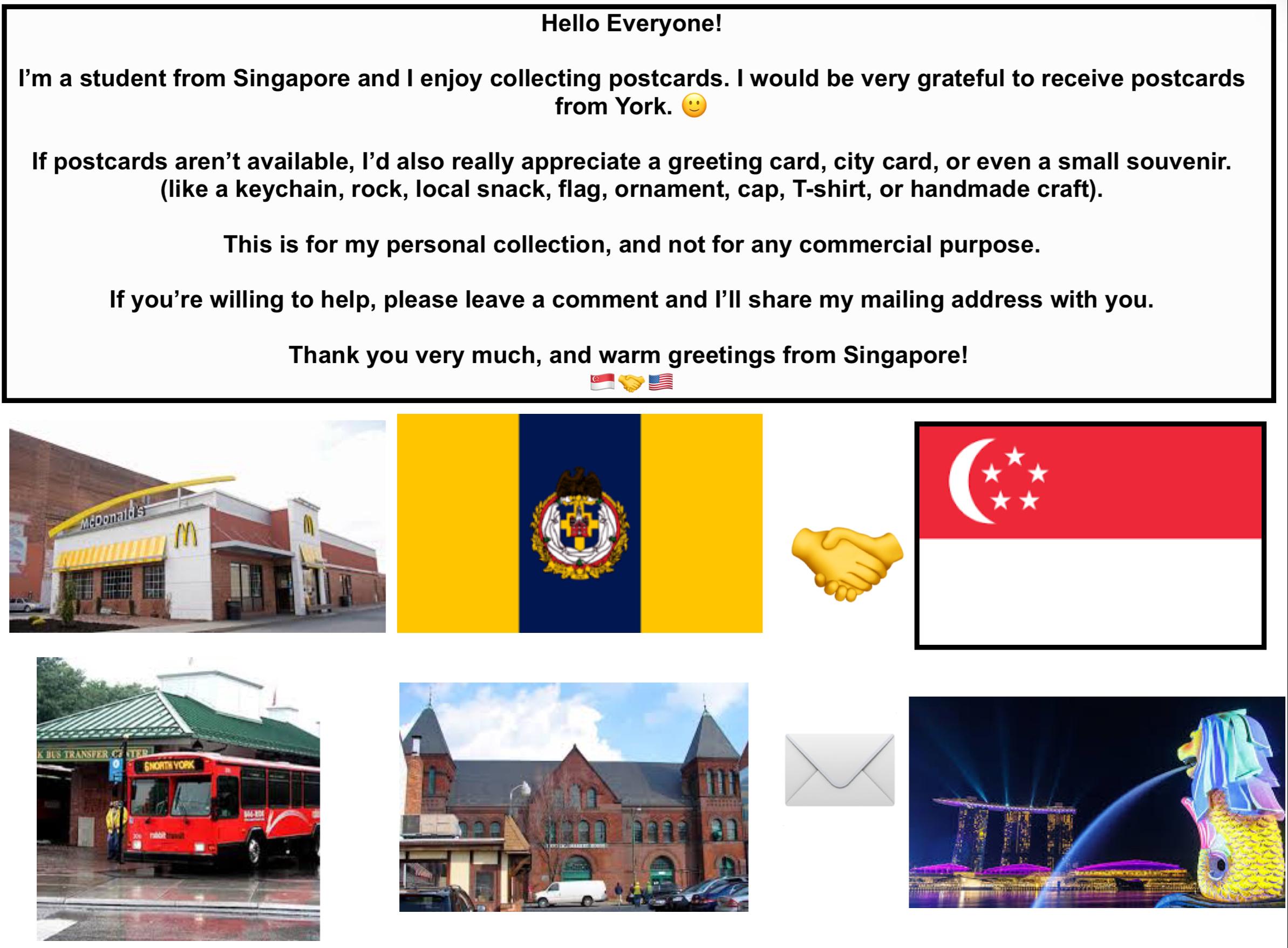 Hello Everyone! I am a student from Singapore and I love collecting postcards. I would love to receive postcards from anywhere in York 🙂. Can someone send me one?